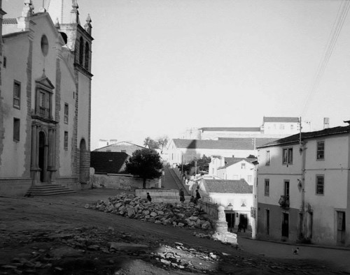 A velha Igreja de São Vicente ainda sem a escadaria actual. Ao fundo o Castelo está dominado pelos edifícios do Quartel de Artilharia, demolidos em 1968-69, quando foram colocadas à vista as presumíveis arcadas do Palácio da Casa de Abrantes.
