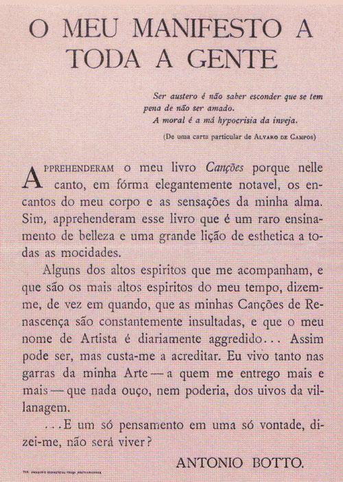 Com análise emotiva das emoções — oposição implícita à análise intelectual delas — quero significar aquele estado em que o poeta, ou homem, se concentra sonhadoramente no que sente, e assim o multiplica, o desdobra, o sente diversa e divididamente. Tal estado merece o nome de paixão, não porque envolva intensidade, mas porque implica absorção. Em António Botto não se dá tal estado. As suas emoções são simples e directas, embora os seus sentimentos — isto é, os prolongamentos temperamentais dessas emoções — sejam porventura complicados. Isto, porém, é já outro assunto, de que mais adiante se tratará.