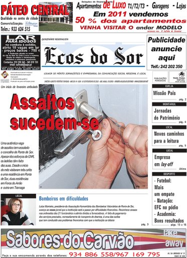 Deliberação: “atribuir uma comparticipação, mensal, ao Jornal ― Ecos do Sor ―, no valor de seiscentos euros (600,00 €) mais IVA à taxa legal em vigor, durante o prazo de doze (12) meses, com início no mês de Janeiro do corrente ano, a título de contrapartida pela publicação e divulgação da informação dos eventos culturais e desportivos, assim como de publicidade do Município. A publicidade de eventos culturais, desportivos e outros também quando temporalmente possível, deverão se publicitados no Jornal a Ponte.”.