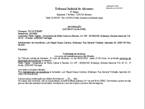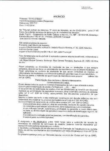 Há dias um leitor enviou-nos o Edital do Tribunal de Abrantes que segue referente à situação da Rádio Tágide